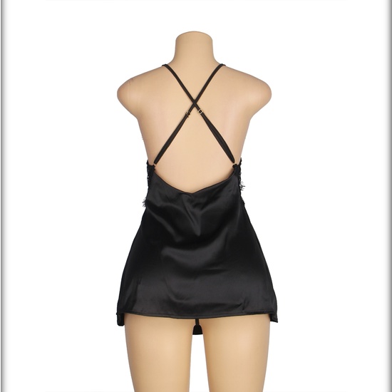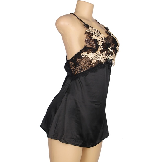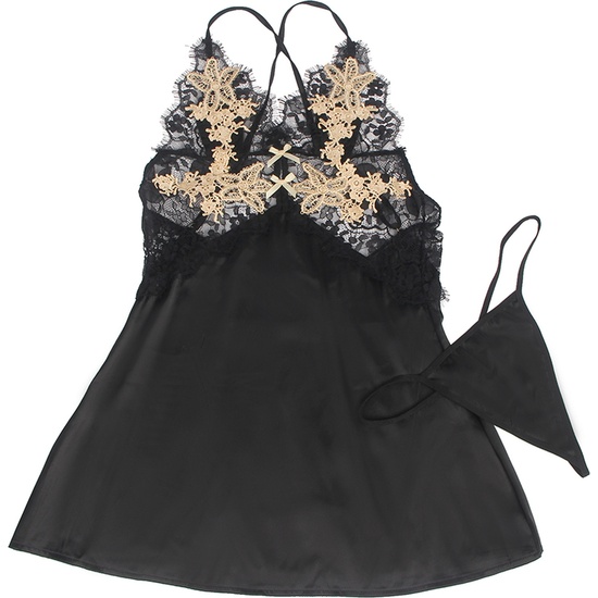 Babydoll con correas cruzadas decoración floralComposición: 95% Polyester + 5% Elastano En color negroCuidados:Lavar a mano con agua fría.Utilizar jabón neutro.No utilizar lejía.Aclarar sin retorcer.Planchar sólo las partes no elásticas
