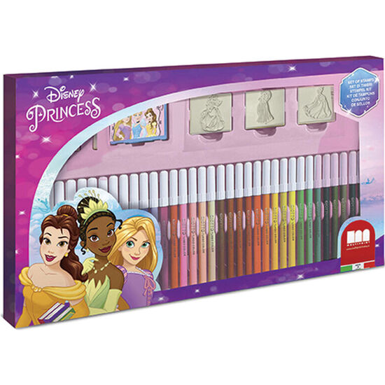 Blister papeleria Princesas Disney 41pzs. Contiene: 3 sellos, 1 libro de actividades, 1 tinta lavable, 36 rotuladores lavables. Tamaño: 43x28x3cm.