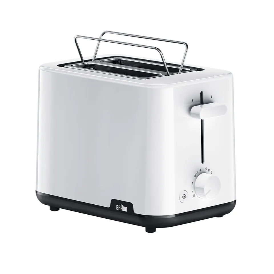 900W. 2 aberturas curtas_ Descongelação e reaquecimento de pão_ 8 níveis de tostagem_ Bandeja para migalhas.