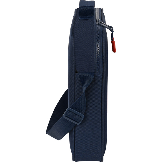 Bandolera ajustable. Asa de mano forrada en la parte superior. Doble tirador en cremallera principal para facilitar su apertura. Fondo interior semirígido extraible.