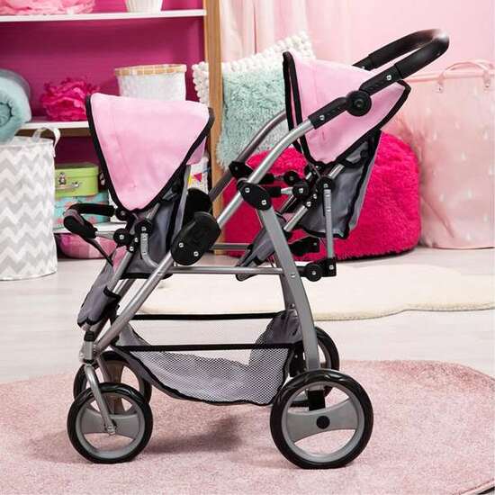 Coche de Muñeca Gemelar Gris/Rosa 76x63x4 6cm. Edad minima recomendada 3A. Edad minima advertida 3A. Sí Montaje necesario. No Utiliza pilas. No Emite sonidos. No Tiene luces. Contenido caja 3