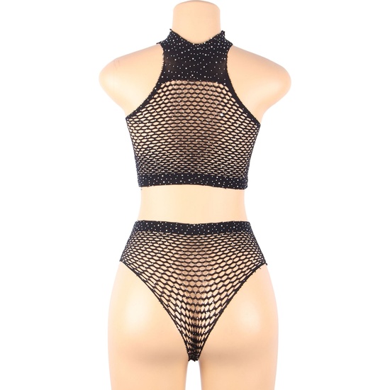 Conjunto de top de bikini y shorts negros de dos piezas con diamantes de imitaciónComposición: 88% Poliamida + 12% Elastano En color negroCuidados:Lavar a mano con agua fría.Utilizar jabón neutro.No utilizar lejía.Aclarar sin retorcer.Planchar sólo las partes no elásticas