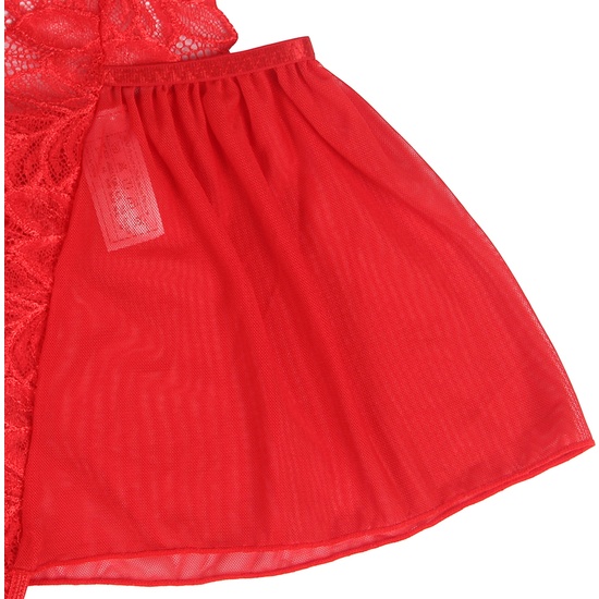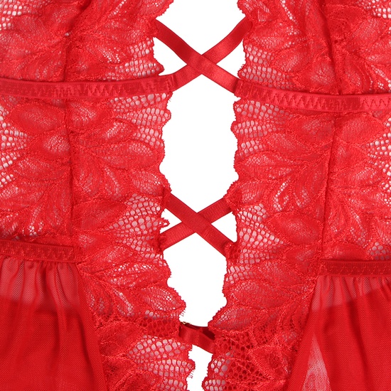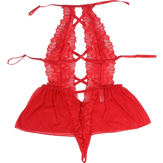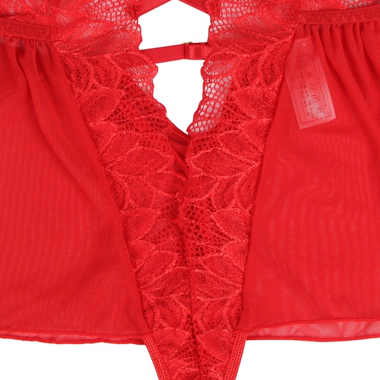 Body de una pieza con encaje rojoComposición: 95% Polyester + 5% Elastano En color rojoCuidados:Lavar a mano con agua fría.Utilizar jabón neutro.No utilizar lejía.Aclarar sin retorcer.Planchar sólo las partes no elásticas