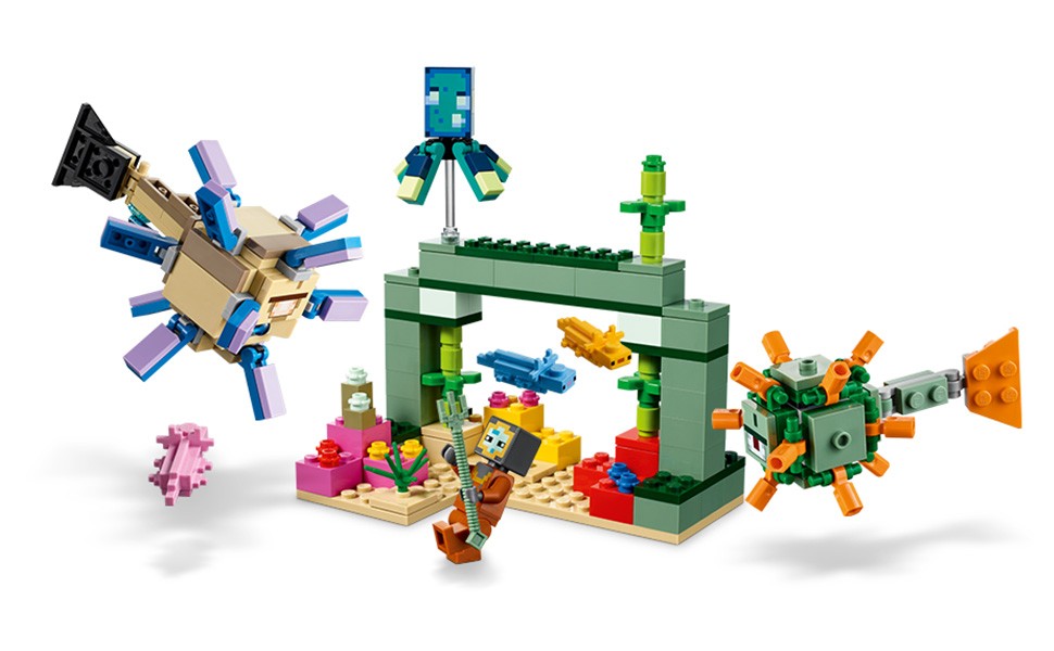 Acción auténtica: Además del arrecife de coral y la estructura del monumento, ambos construibles, incluye emblemáticos personajes Minecraft® (un buceador, un calamar brillante, un guardián, un guardián anciano y 3 ajolotes)