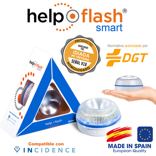 HELP FLASH es una baliza luminosa de emergencia de alta calidad, autónoma, compacta y ligera. Homologada de conformidad con la Normativa de Seguridad Vial vigente para V16 con número IDIADA PC 19010265.