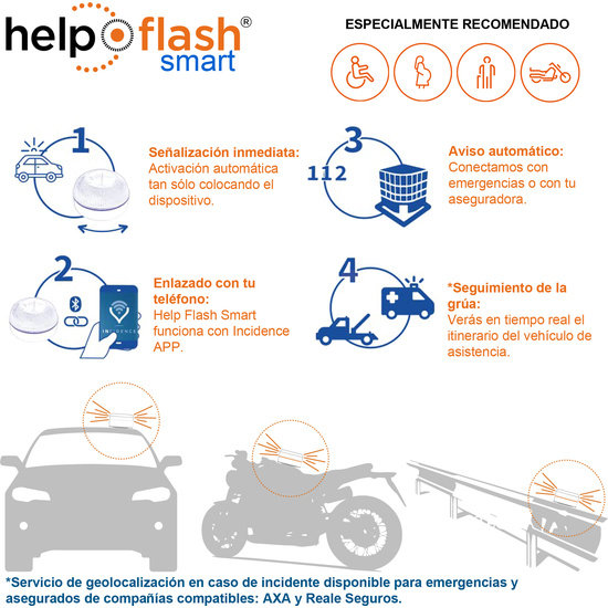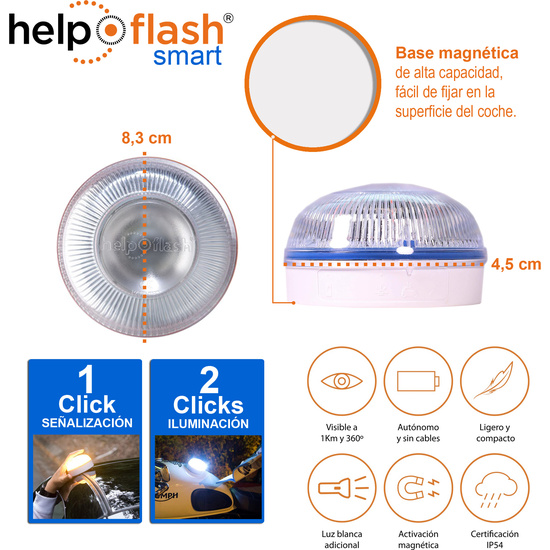 USO HELP FLASH – Esta baliza sirve como señalización de emergencia en general, pero es especialmente eficaz en seguridad vial en casos de parada, avería o accidente. Con sólo colocarlo en el techo o la bionda, logrará alertar de forma inmediata sobre un obstáculo en la calzada, y reducir su nivel de estrés para tomar decisiones. Lleve el equipo siempre a su alcance, en la guantera, o en la maleta de su motocicleta. Úselo cuando precise hacerse ver o ser localizado. Ponga siempre el equipo antes de salir del coche, en el punto más alto posible para ser visto desde lejos, y evitar los peligros de la colocación de los triángulos. Dimensiones: 8,5 cms diámetro x 5 cms.