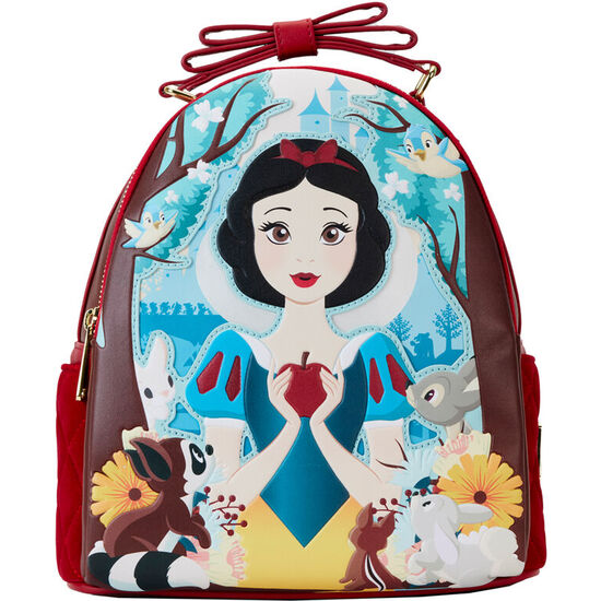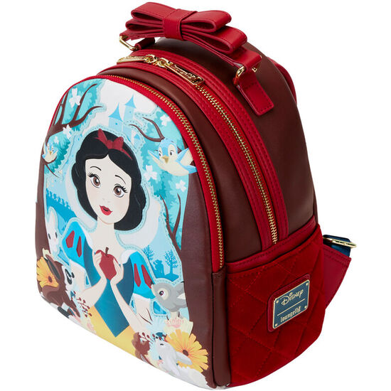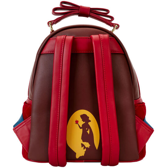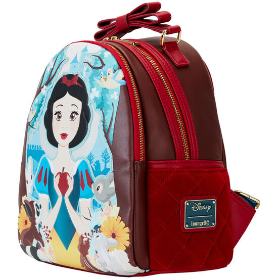 Mochila Blancanieves Disney Loungefly 26cm. Tamaño: 26,25×22,5×11,25cm. La mochila incluye herrajes metálicos dorados, correas ajustables, bolsillos laterales, piel vegana (poliuretano), asa con lazo y detalles estampados, de terciopelo empenachado, iridiscentes y apliques. Destaca el forro a juego.