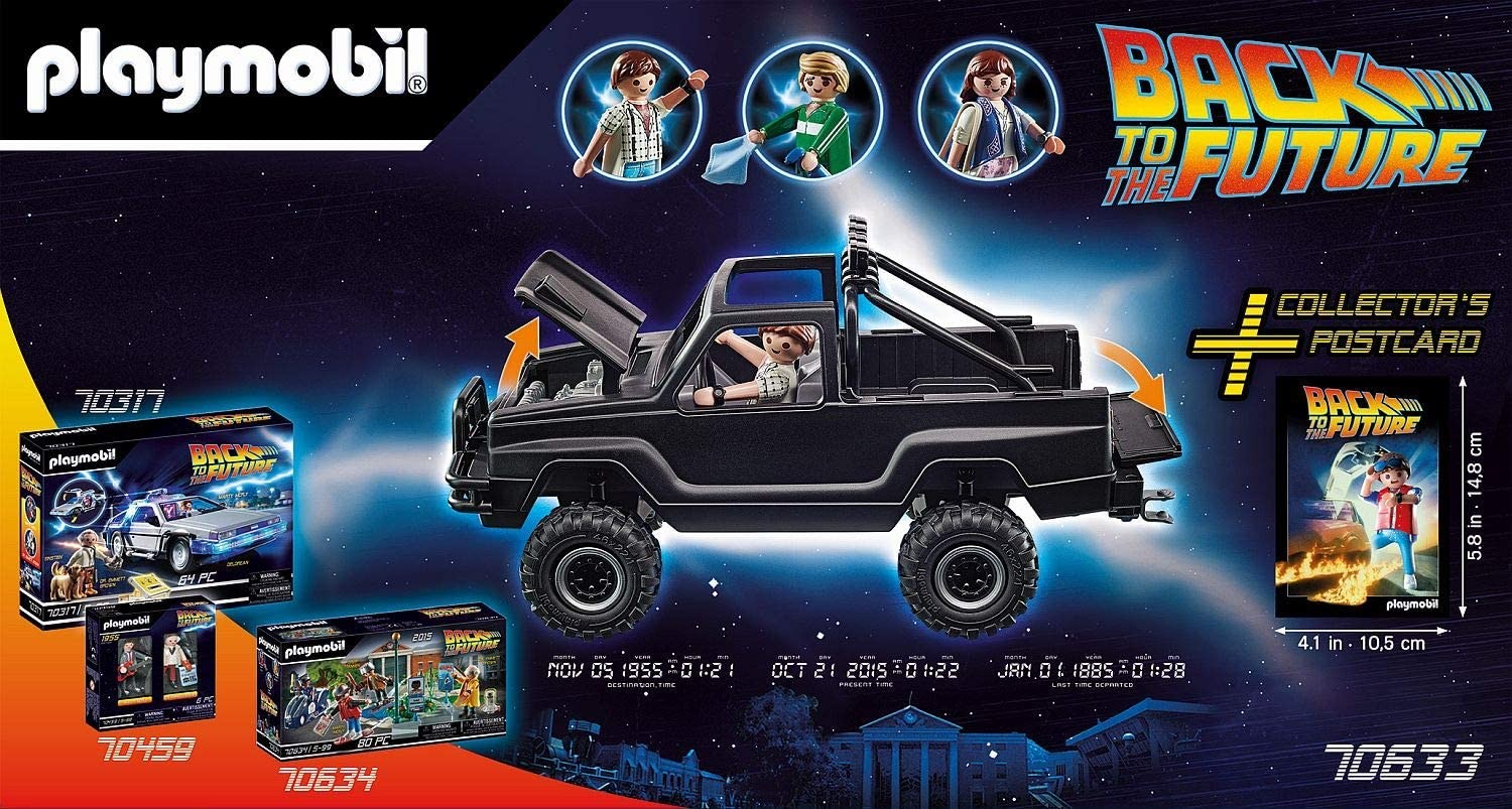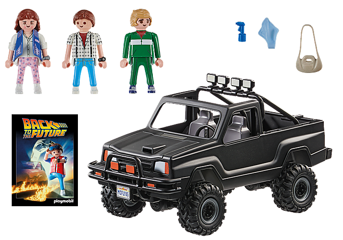 ¡Dios mío! Los locos viajes en el tiempo de Marty McFly continúan. Marty acaba de llegar a 1985 cuando el siguiente salto en el tiempo – al año 2015 – está en el horizonte. Basado en la segunda película de la trilogía de culto, Doc y Marty deben evitar que el hijo de Marty sabotee el futuro de la familia McFly. En 1985, Marty se sube a su flamante camioneta con su novia Jennifer Parker y conduce por las calles de Hill Valley. Pero en el futuro, el archienemigo de Marty, Biff Tannen, está alerta y no escatima en esfuerzos para ir a por Marty. El nuevo set de juego trae de nuevo a los fans de PLAYMOBIL de regreso al futuro. El set incluye a Marty McFly, Jennifer Parker y Biff Tannen, así como una camioneta Pick-up con espacio para dos figuras y una postal de coleccionista para los fans. El capó y el portón trasero de la camioneta se pueden abrir. Dimensiones: 25 x 12 x 13 cm (LxPxA). Recomendado para edades comprendidas entre los cinco y los noventa y nueve años. Advertencia. Peligro de asfixia. Piezas pequeñas. No apto para niños y niñas menores de 3 años.