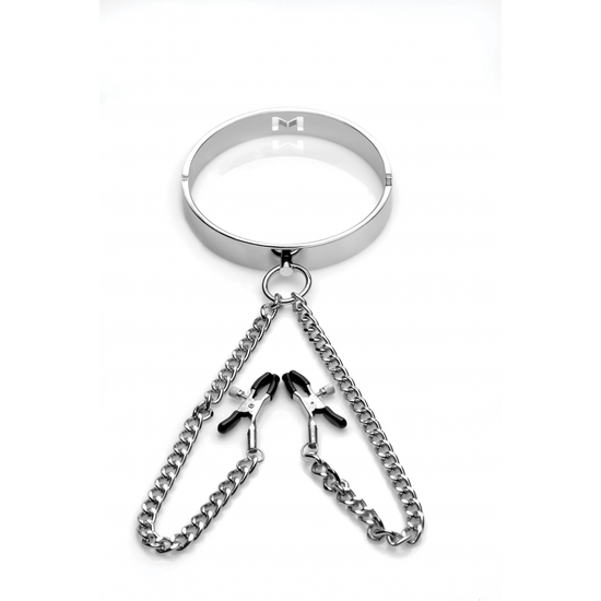 Una actualización del collar esclavo cromado original, este modelo presenta un conjunto de abrazaderas unidas por cadenas cromadas a juego que le permiten aplicar un dolor exquisito a sus bonitos pezones y recordarles quién tiene el control.