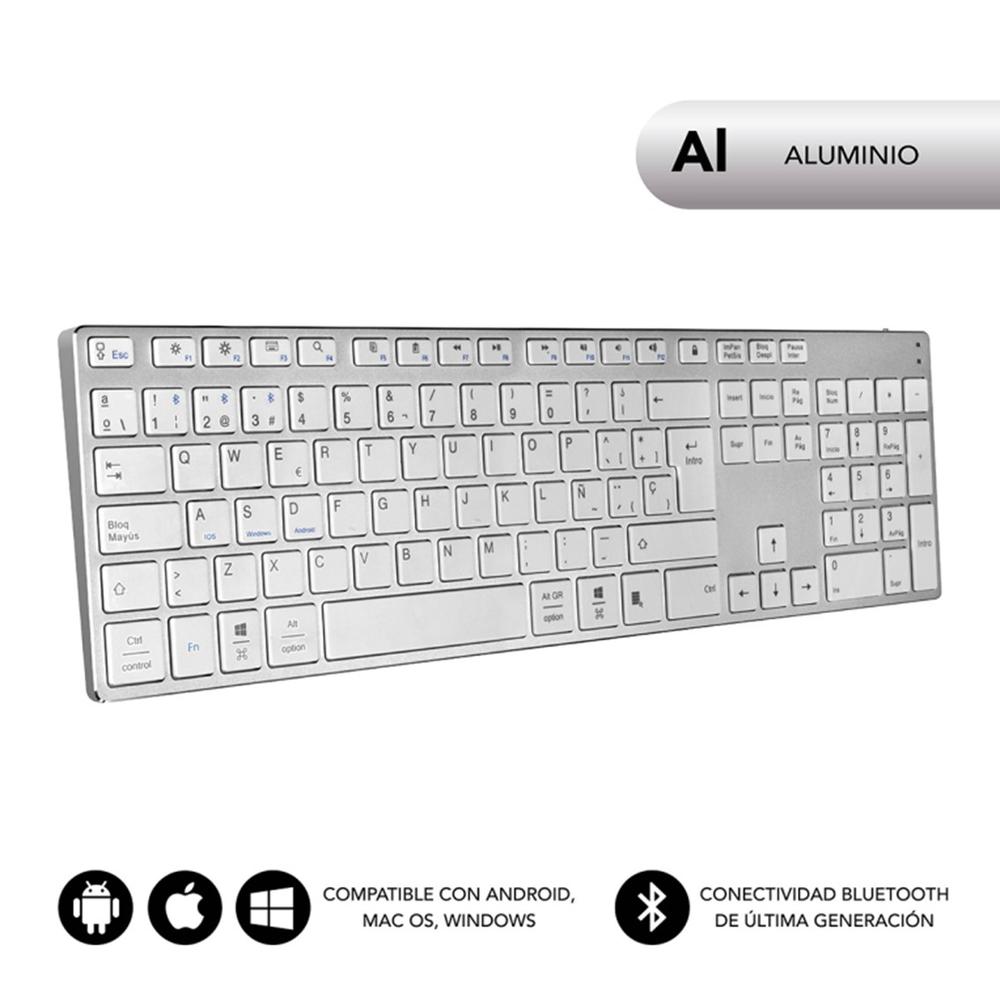 el elegante teclado inalámbrico bluetooth advance extended de subblim – presenta un acabado en aluminio cepillado y teclas con mecanismo en tijera. es compatible con mac – windows o tablets ios y