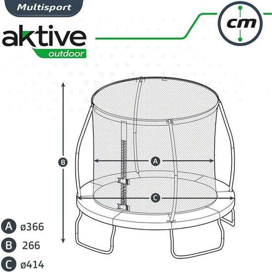 Trampolín con red 366 diámetro x 266 cm altura soporta 100 Kg . Edad minima recomendada 6a. Edad minima advertida 6a